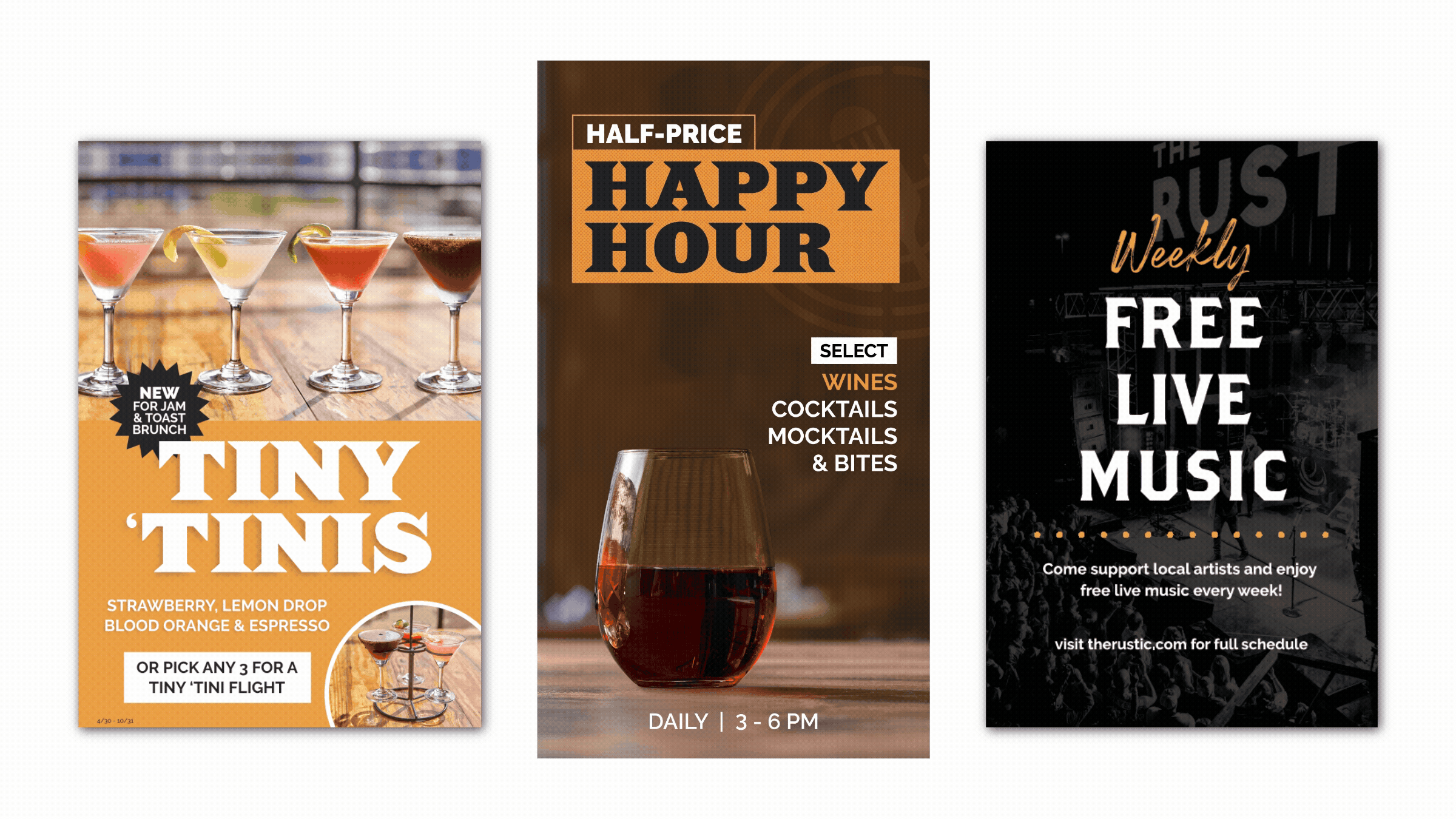 As Art Director for FreeRange Concepts, I led a strategic reset of The Rustic’s brand system after years of visual inconsistency. I re-established the brand through a refreshed set of guidelines built around three core pillars: Live Music, Evergreen Food & Beverage, and Large-Scale Seasonal Events. This work created a clear, scalable foundation that empowered the creative team to produce cohesive, on-brand marketing across all channels and future campaigns.